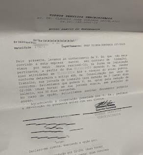 A empresa de terceirização de serviços Toppus, que presta serviços à Prefeitura, enviou notificações de aviso prévio a mais de 100 colaboradores que trabalham na Secretaria de Educação do município.