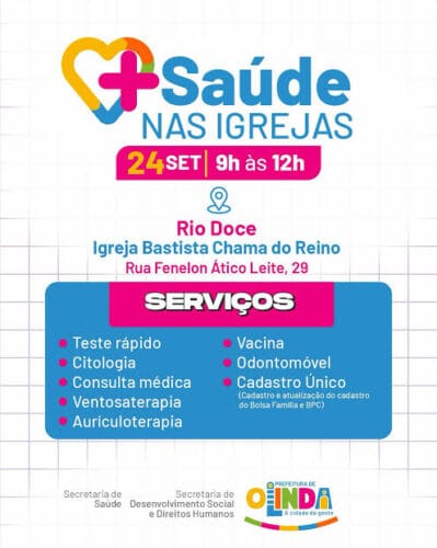 A prefeita de Olinda, Mirella Almeida (PSD) anunciou nesta semana, o programa “Saúde nas Igrejas” que visa levar atendimento especializado de saúde por meio de atendimentos feitos em algumas instituições religiosas do município, sobretudo as evangélicas.