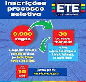 O governo de Pernambuco, por meio da secretaria de educação abriu, na última terça-feira (10) as inscrições para os estudantes participarem da seleção para a composição das 9.900 vagas disponíveis nas Escolas Técnicas Estaduais (ETEs).