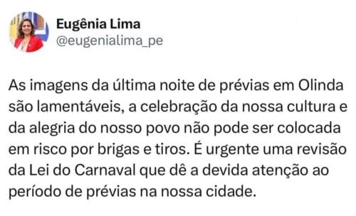 Para Eugênia, “a celebração da nossa cultura e alegria do nosso povo, não pode ser colocada em risco”. Segundo a parlamentar, é urgente que o poder público revise a lei do carnaval, dando a devida atenção às prévias de Olinda.