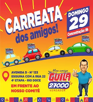 O candidato a vereador, Guila (DC), está chamando seus amigos e eleitores para uma grande carreata, visando coroar sua campanha na cidade.