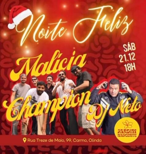 No próximo sábado (21), às 18 horas, no Jardim Nascente, a banda Malícia Champion, junto com o DJ Neto participarão da festa, Noite Feliz.