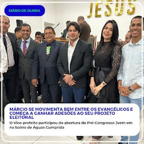 Marcio tem recebido um conjunto de lideranças do segmento, as conversas tem sido contínuas, o que está lhe dando condições de transitar bem entre os evangélicos. Ontem mesmo, dia 26/04, a convite do pastor Paulo Fernandes e do presbítero Adonias, o vice-prefeito participou da abertura do Pré-Congresso Jovem da área 26, em Águas Compridas.