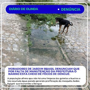 Estamos vivendo uma epidemia de Dengue em todo país, e no bairro de Jardim Brasil, os moradores denunciam que por falta de manutenção da prefeitura, a comunidade está cheia de foco do mosquito Aedes Aegypti, transmissor da Dengue.