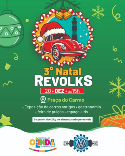 A cidade de Olinda, na Região Metropolitana do Recife, recebe neste sábado (20) a 3ª edição do Natal Revolks, evento gratuito que promete movimentar a Praça do Carmo e o Sítio de Seu Reis, das 15h às 23h.