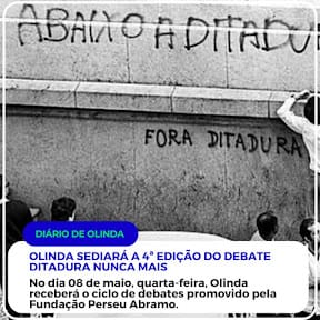 No dia 08 de maio, quarta-feira, Olinda receberá o ciclo de debates promovido pela Fundação Perseu Abramo, intitulado de “Ditadura Nunca Mais”. O evento é aberto ao público e será realizado no Centro de Cultura Professor Luiz Freire, situado no Carmo, tendo como tema, “Militares e Política: golpismo e entraves à democracia no Brasil”.