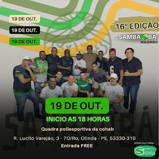 E no próximo dia 19 de outubro, sábado, teremos a 16° edição do Sambaobá, na quadra da Cohab, Ouro Preto, é lá que o samba, a cultura, o lazer e a comunidade se misturam numa grande festa.