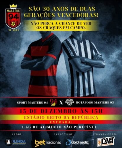 No próximo domingo(15), os times masters do Sport e Botafogo se enfrentarão no estádio Grito da República, em Rio Doce.