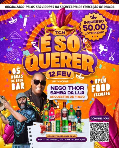 O evento contará com open bar e open food, oferecendo feijoada, drinks variados, cerveja, gin, whisky, refrigerante e água.