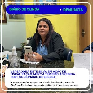 A vereadora Dete Silva (PCdoB) afirmou que, em ato de fiscalização na escola CAIC, em Peixinhos, houve a tentativa de impedir a parlamentar de cumprir com seu papel de fiscalização, e ainda, na ocasião foi agredida por um funcionário da escola.
